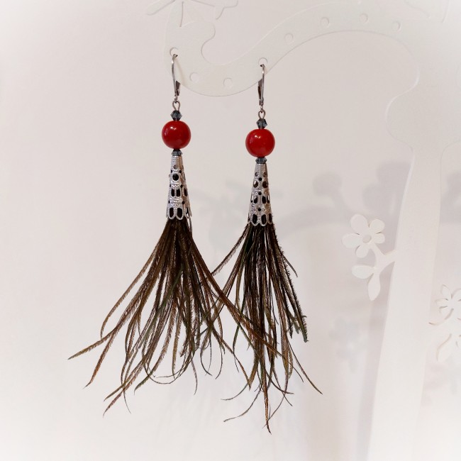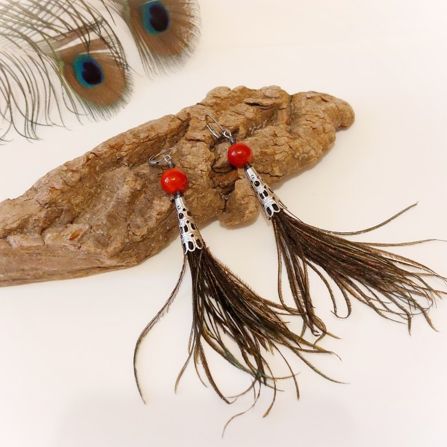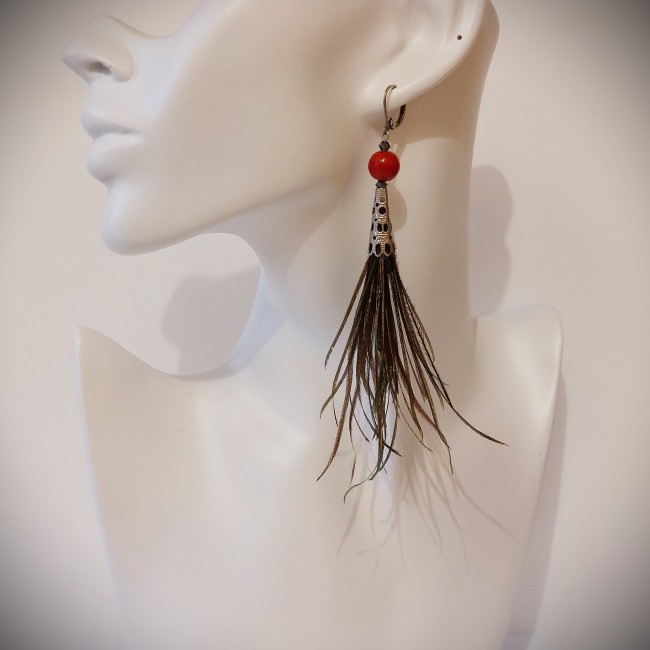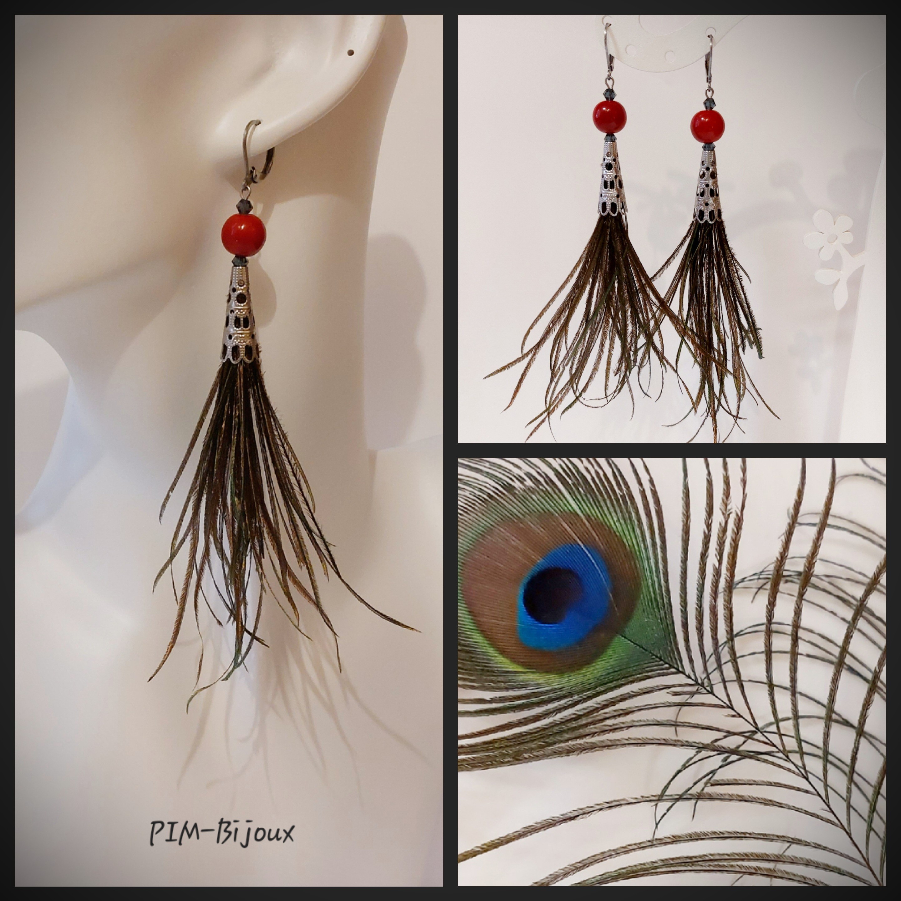 Longues boucles d'oreilles créées avec la partie basse d'une plume de paon.