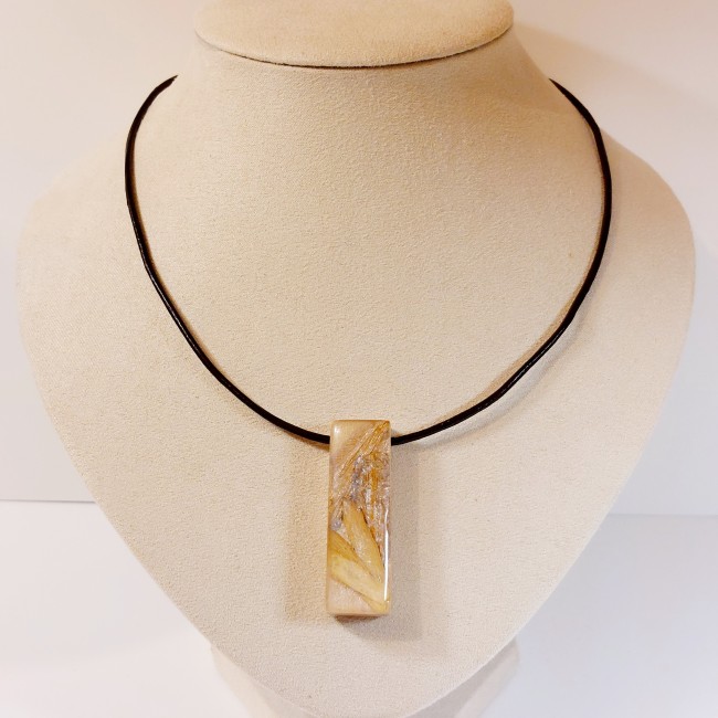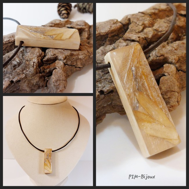 Ce collier artisanal avec son pendentif bois et résine est très lumineux avec une petite touche pailletée.